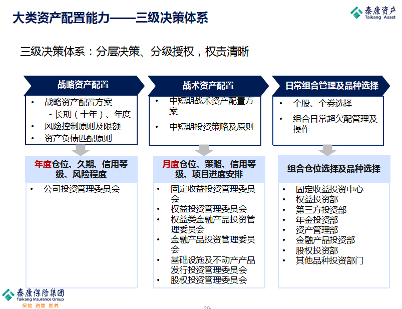 泰康資管設立三級決策體系,即戰略配置由投委會決策,戰術配置由部門決策,日常選股由基金經理自行決策,此外給予基金經理15%左右的自行決策權限。