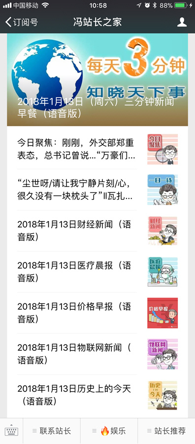 另外還有“一日一詩”也是原創,為什麼在這麼一個大号裡面放一個相對來說閱讀量并不算高的原創詩欄目?對此馮站長套用經典來解釋:生活不止是苟且,還有詩和遠方。所以即使閱讀量隻有兩萬多,馮站長仍然堅持推送“一日一詩”,這個欄目很受詩歌界老師歡迎;同樣還有“财經新聞”、“醫療晨報”、“價格早報”、“物聯網”以及“曆史上的今天”這些内容。