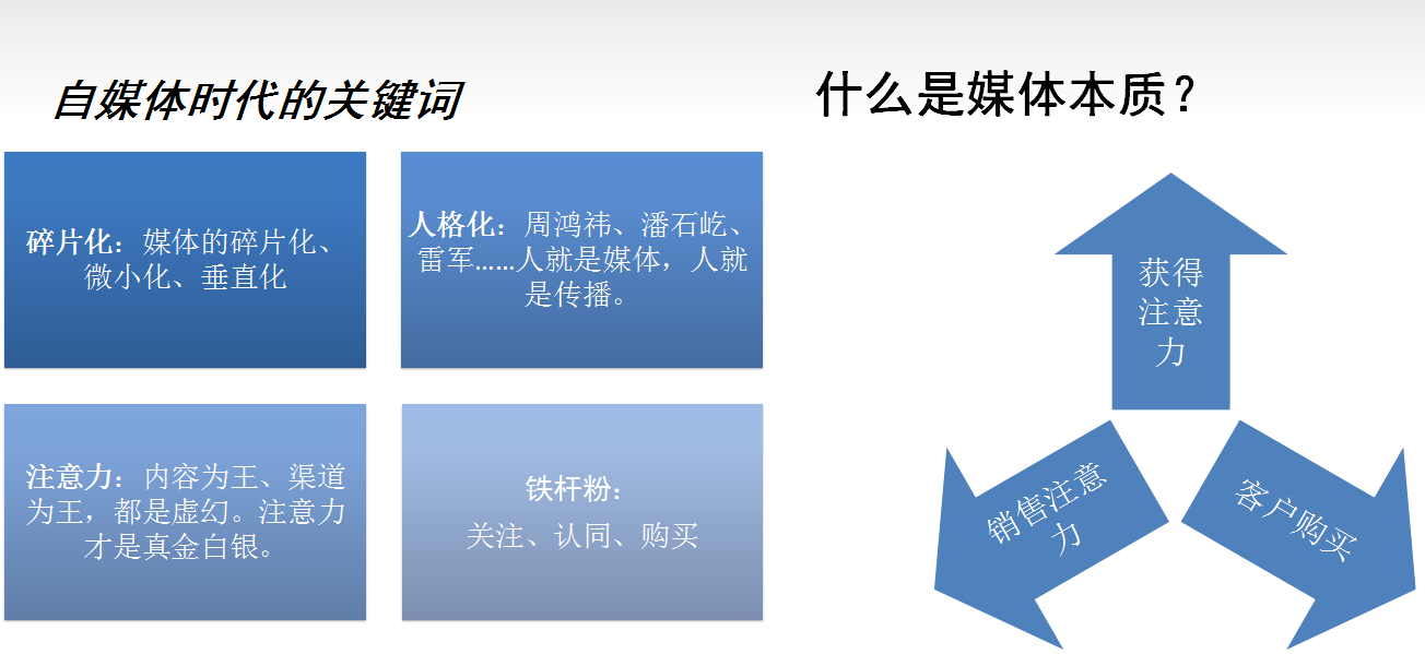 1)自媒體是指私人化、平民化、普泛化、自主化的傳播者,以現代化、電子化的手段,向不特定的大多數或者特定的單個人傳遞規範性及非規範性信息的新媒體的總稱,也叫“個人媒體”。包括BBS,博客,SNS,微博,微信等。