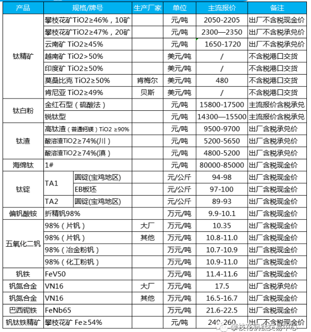 8月19号釩钛産品報價